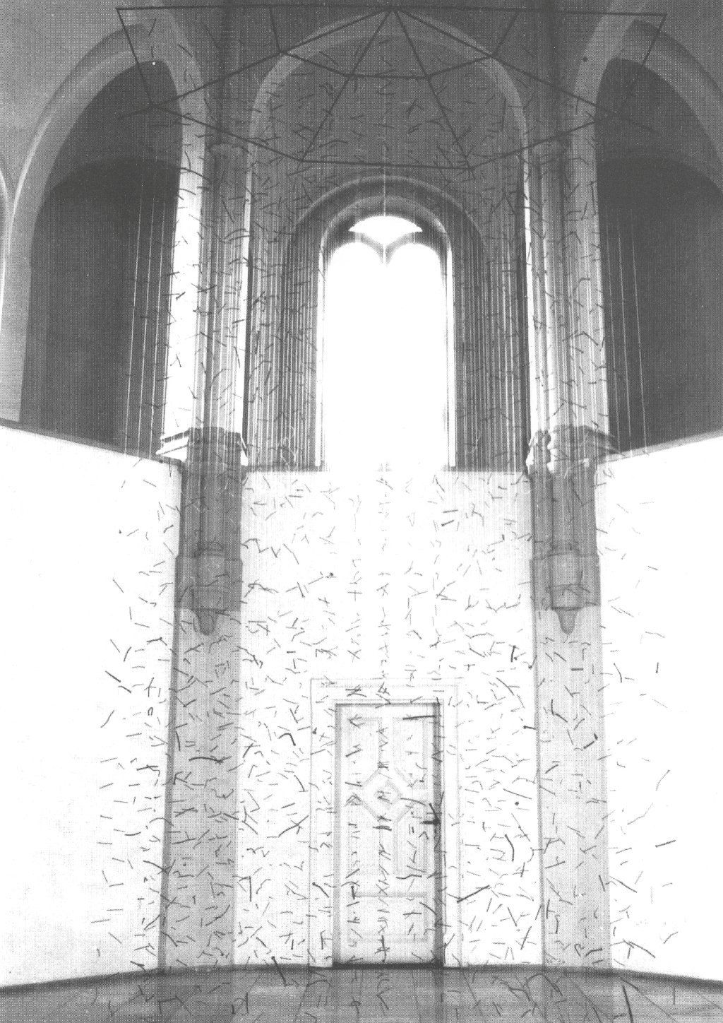 Nagelinstallation in der Christuskirche Freiburg Eisengestell rostige Nägel Nylonfäden 1996