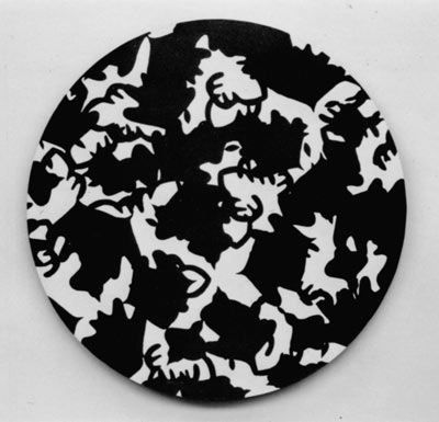 Diese Bilder basieren alle auf den selben Grundformen, die Rost als Papierschablonen anfertigt und dann immer wieder neu kombiniert. Das kreisrunde Bildformat erlaubt kein oben, kein unten, das Bild ist nach allen Seiten offen. Auch die Frage, welches denn nun die Figur und welches der Hintergrund ist, lässt sich nicht immer eindeutig klären. Die Rückübersetzung in die Grundformen scheitert häufig an der Komplexität der Formenüberlagerung und -kombination.