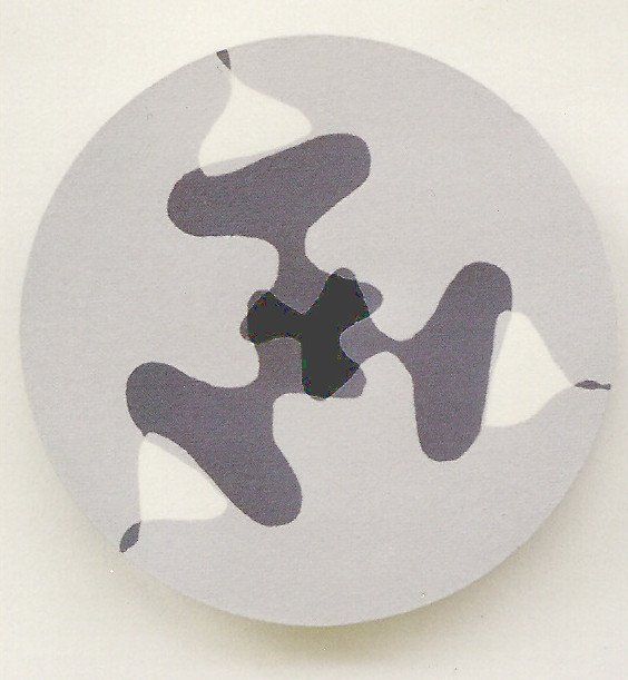 These pictures are all based on the same basic shapes that Rost makes as paper templates and then combines them again and again. The circular image format does not allow any top or bottom, the image is open to all sides. The question, which is the figure and which is the background, cannot always be clearly clarified. The back translation into the basic forms often fails due to the complexity of the overlay and combination of forms.