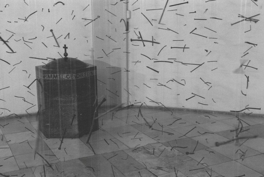 Nagelinstallation in der Christuskirche Freiburg Eisengestell rostige Nägel Nylonfäden 1996
