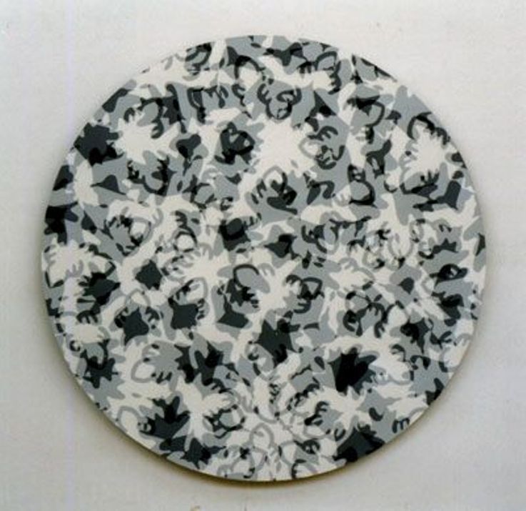 These pictures are all based on the same basic shapes that Rost makes as paper templates and then combines them again and again. The circular image format does not allow any top or bottom, the image is open to all sides. The question, which is the figure and which is the background, cannot always be clearly clarified. The back translation into the basic forms often fails due to the complexity of the overlay and combination of forms.